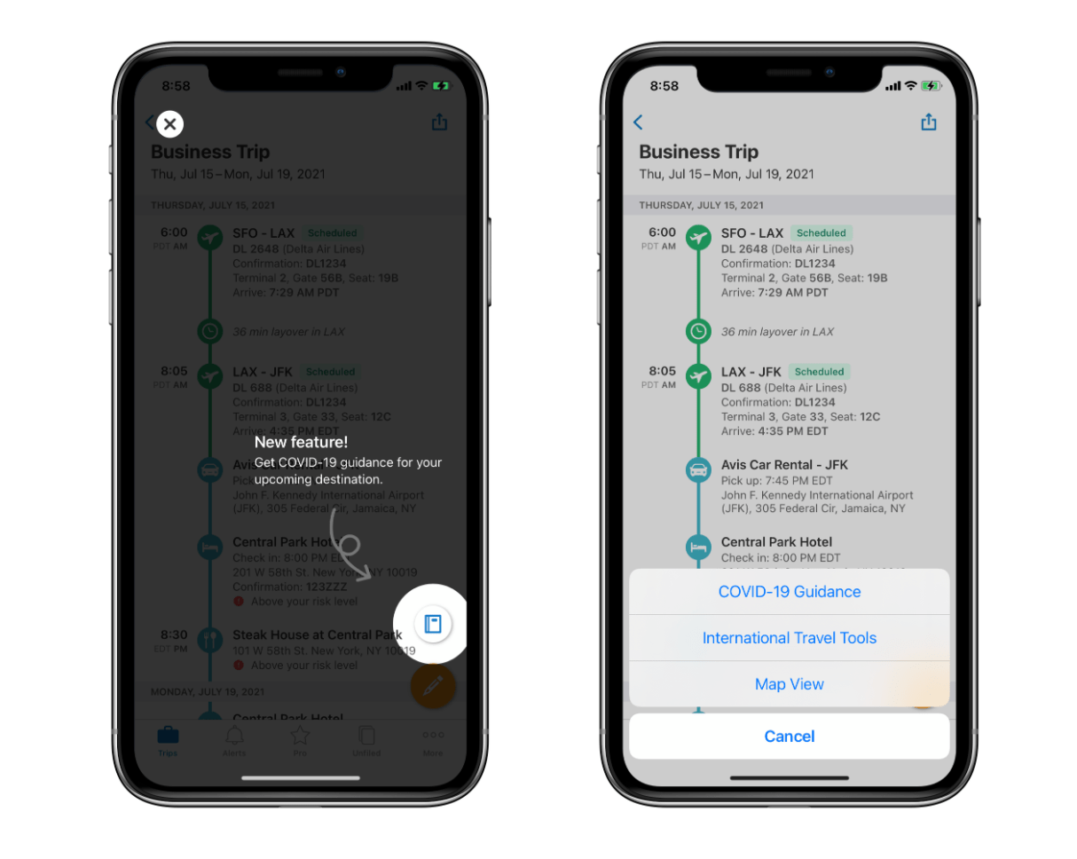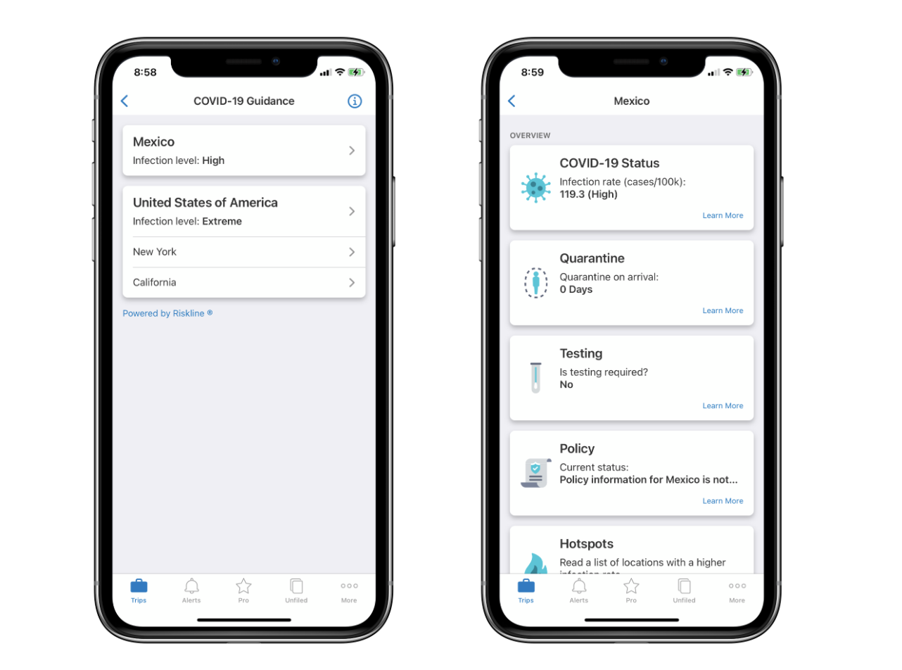 TripIt, a subsidiary of corporate-expense software company SAP Concur, is a mainstay among business travelers. Its COVID-19 guidance, surfaced from travel-risk intelligence firm Riskline, can be found using the Guidebook button on the trip itinerary screen of the TripIt mobile app.