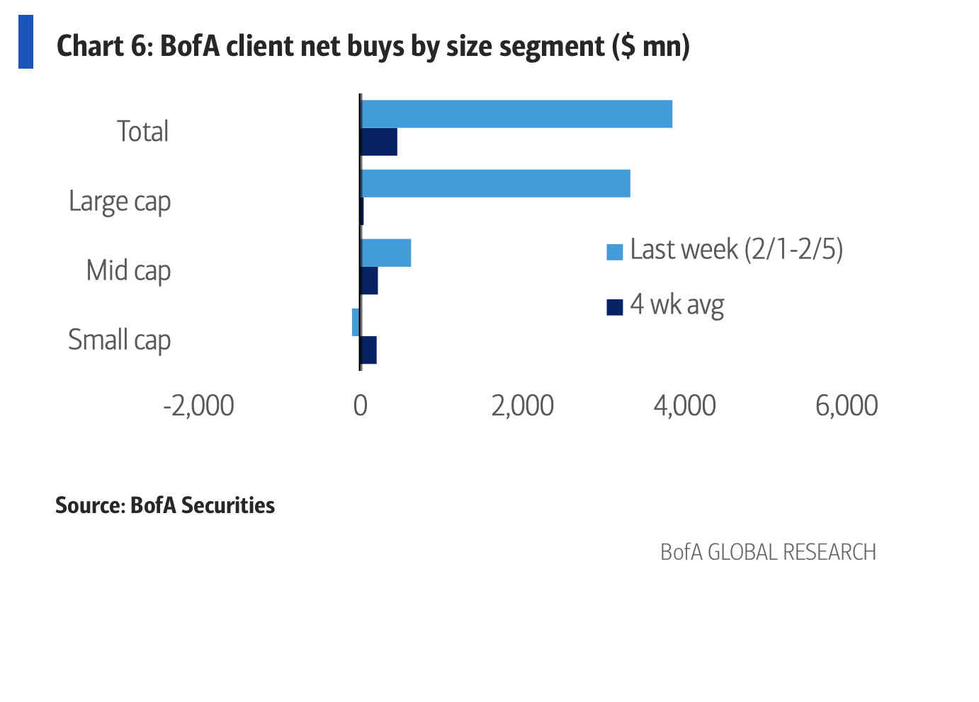 “Institutional clients,” they wrote, “drove sales of small caps last week; retail clients continued to buy them but with much more muted inflows than the prior week (while hedge fund flows were essentially neutral). Meanwhile, large caps saw the largest inflows in seven weeks, with buying across client groups.”