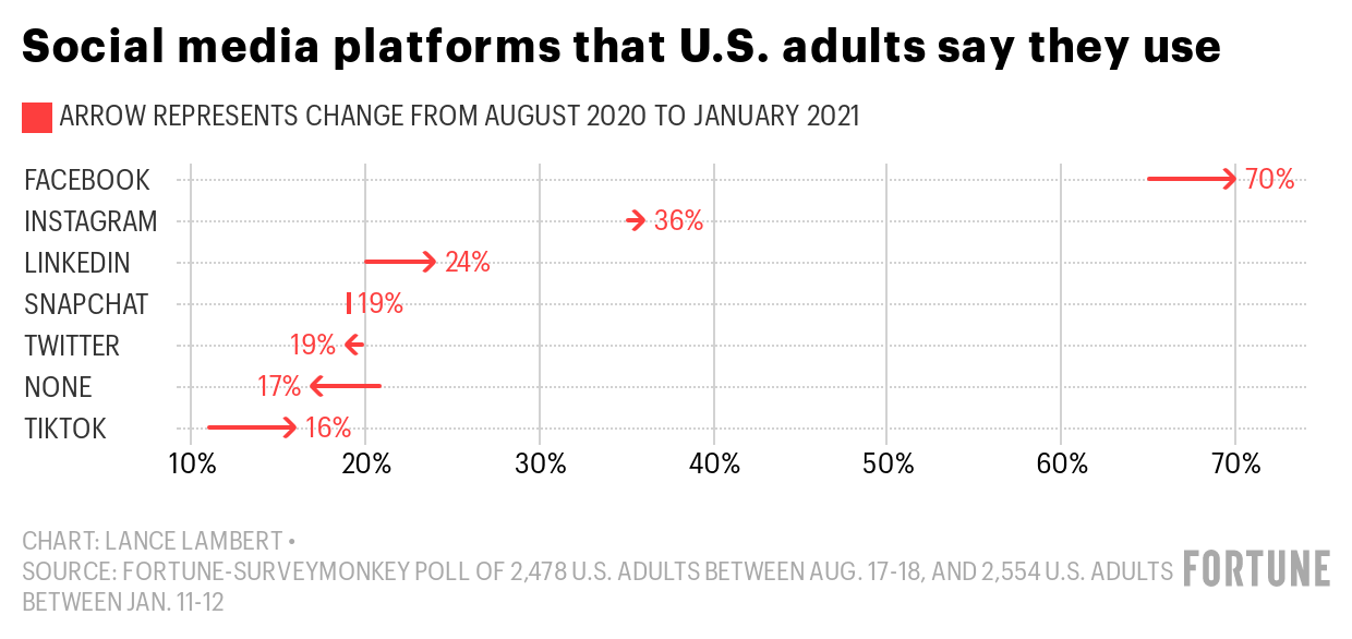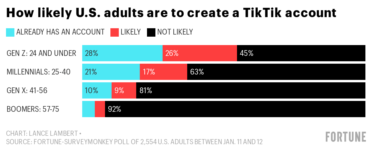 To find out where TikTok is headed, Fortune and SurveyMonkey polled 2,554 U.S. adults between January 11 and 12.* We measured TikTok’s short-term growth by comparing the results to our August 17-18 poll. (Our margin of error in both polls is 3 percentage points.)