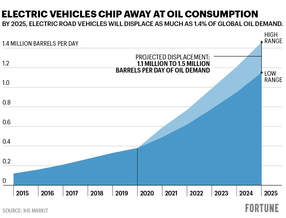 Oil’s days hardly are numbered. IHS estimates that electric vehicles will reduce global oil demand by about 1.1 million barrels per day in 2026, only about 1% of what IHS Markit figures global demand that year otherwise would be. The majority of oil demand, which is burned in heavy trucks, airplanes, industry, and other non-road uses, wouldn’t be affected by the rise of electric cars. Indeed, the biggest automotive hit to global oil demand is likely to continue to come not from electric vehicles but from the increasing fuel economy of internal-combustion-powered models. Exxon Mobil said in a 2019 report that even if all cars and light trucks sold globally in 2025 were electric—a shift so aggressive that it’s a mere modeling exercise rather than a view of a likely future—oil demand that year still would have fallen back only to its 2013 level. Layering the drop-off in oil demand induced by the pandemic onto the erosion from electric-car sales might push the level of oil consumption in 2025 back further, Exxon Mobil says, perhaps to the 2010 level.