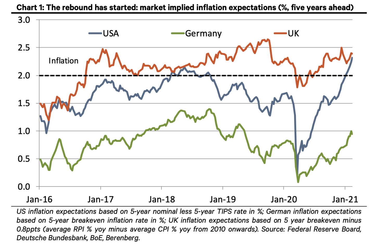But let’s first come back to present day. Inflation expectations are indeed beginning to rise quickly, as the German investment bank Berenberg points out in the chart below. We’re still talking relatively tame implied inflation rates of below 2.5% in the U.S. and Britain. Still, it’s the trend line that’s getting attention.
