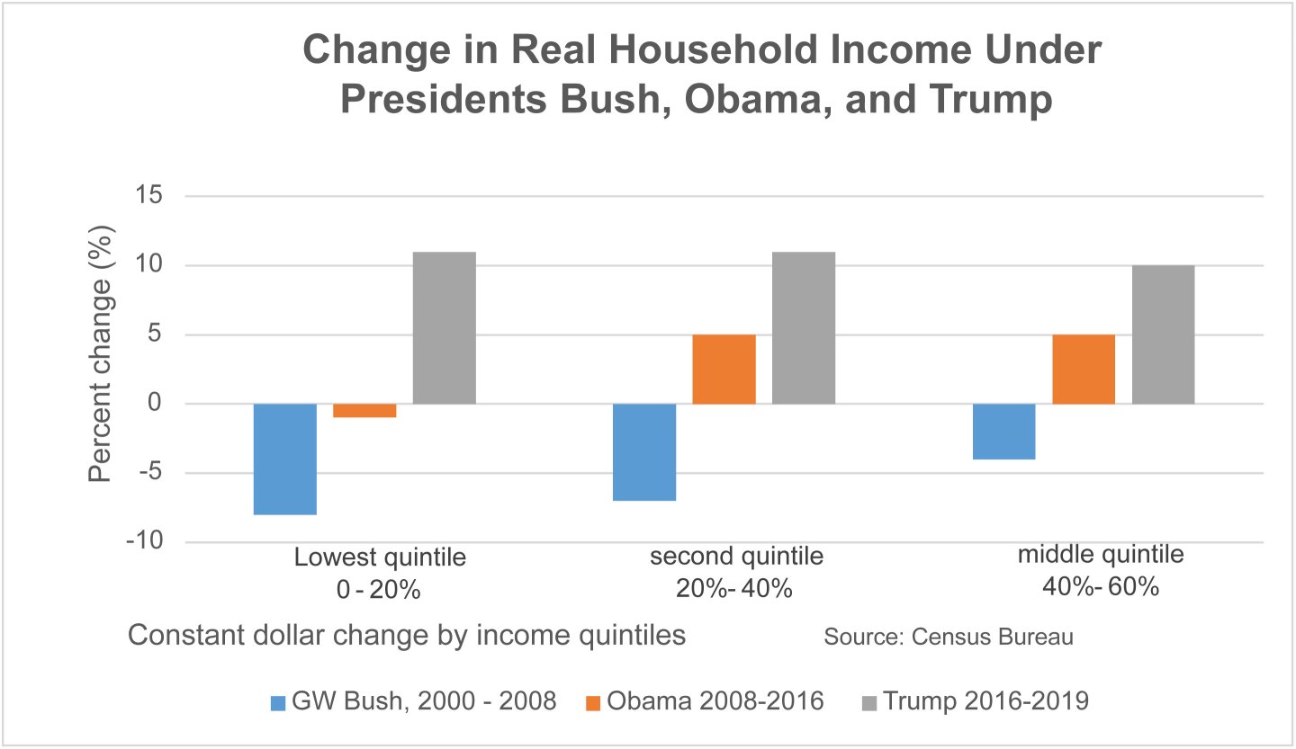 Trump benefited from a tight labor market pre-COVID that pulled noncollege voters from economic purgatory into the mainstream. He prevailed 67% to 32% among non–college-educated whites, for instance, improving significantly over 2016 in counties where incomes were at the national median or less. Real incomes of lower-income households rose at the fastest rate in 50 years under Trump. Indeed, the 11% rise in incomes during 2017–19 under Trump for the poorest quintile of American households was a sharp reversal of their dismal experience under Democrats: For five years under Obama, the real household incomes of the poorest Americans were actually lower than in 1973, when adjusted for inflation. Moreover, the gains for the second and middle quintiles under Trump were twice that during the entire eight years of Obama’s presidency.