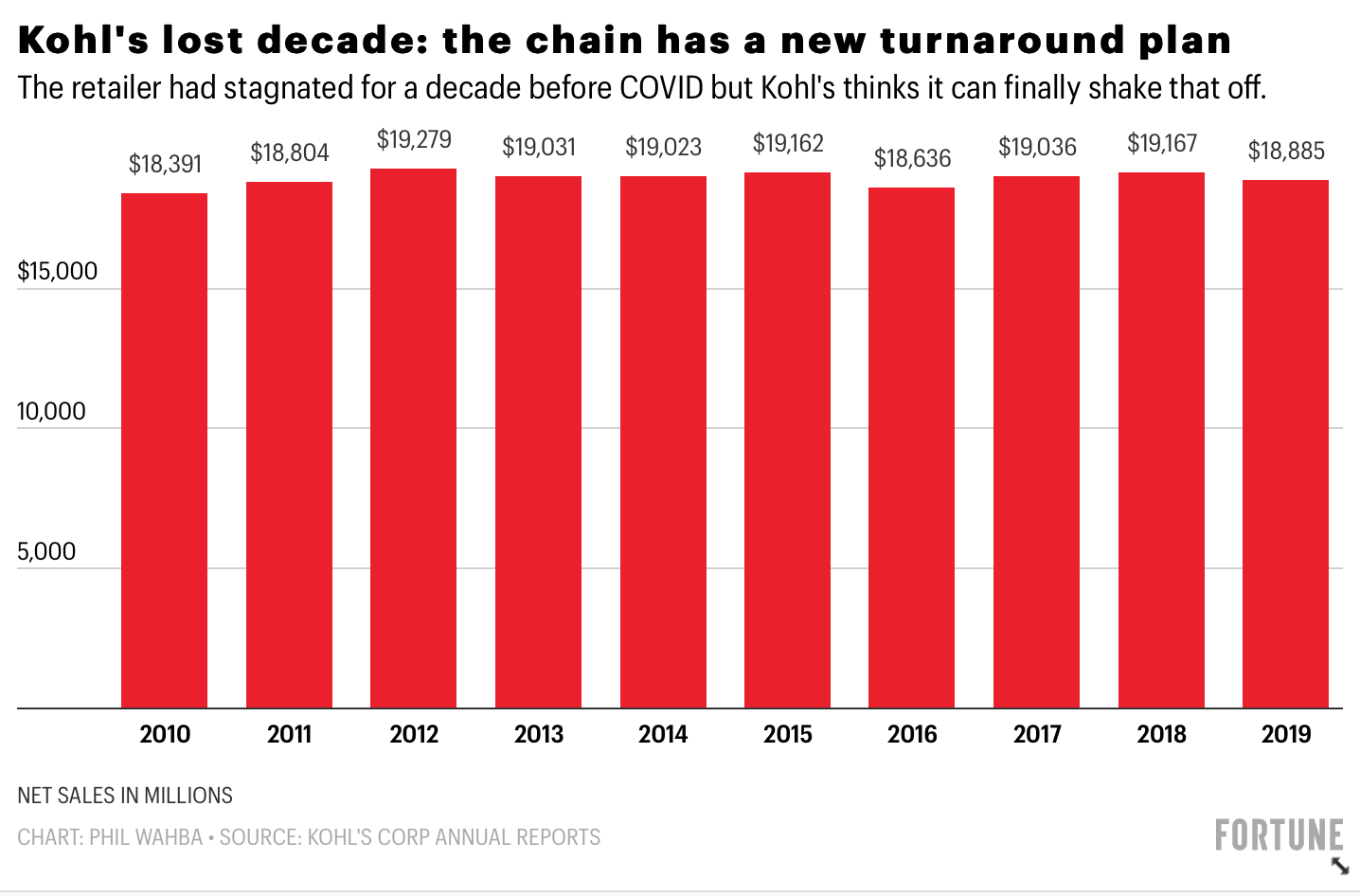At the top of their list of complaints is a net sales level that remained virtually unchanged between 2011 and 2019 despite a number of turnaround attempts, including one announced in October, and an operating profit margin that fell by nearly half during that time, despite Kohl’s ostensibly taking market share from weakened mall-based rivals like J.C. Penney and Macy’s.