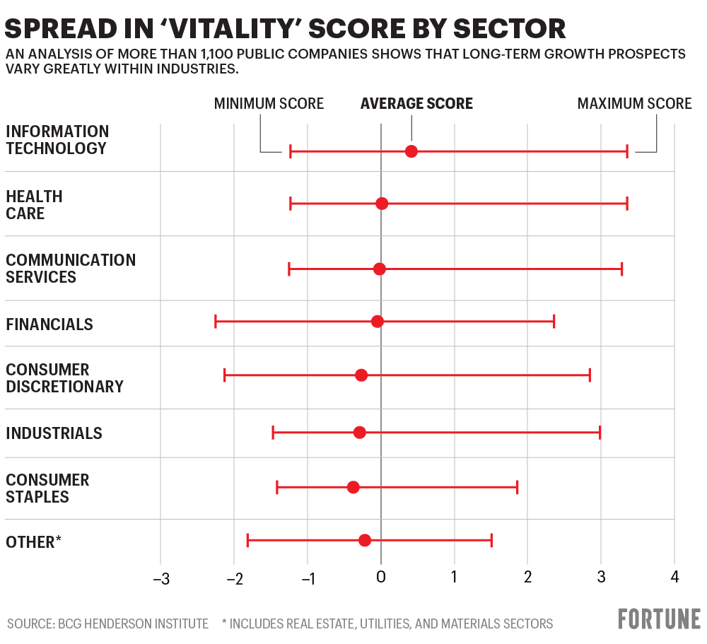 A deeper look, however, reveals that industry is not destiny. Our analysis reveals a wide range in corporate vitality (our term for a company’s capacity to innovate, reinvent, and sustain long-run growth) within all sectors—and therefore opportunity to gain future advantage everywhere. Many of our winners were non-tech-sector companies deploying new business models, often employing technology to enable those changes.