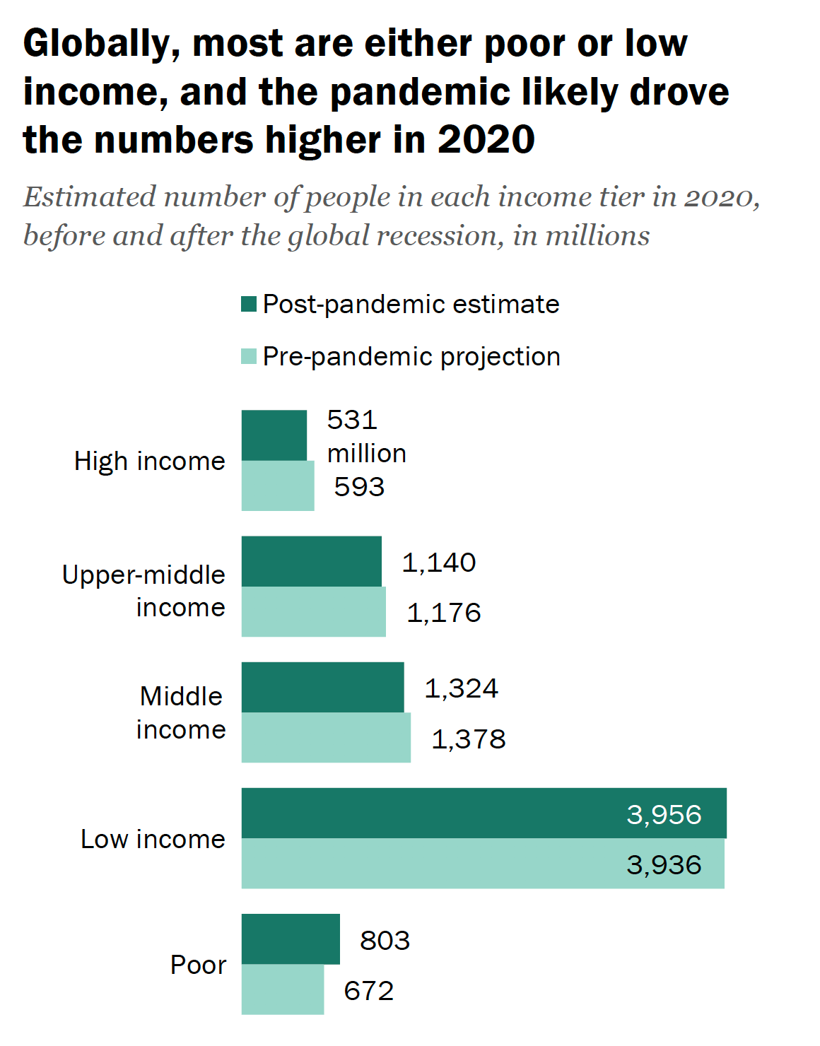 Before COVID-19, in 2020, Pew counted some 1.38 billion people as part of the global middle class. Now that figure is estimated at 1.32 billion.