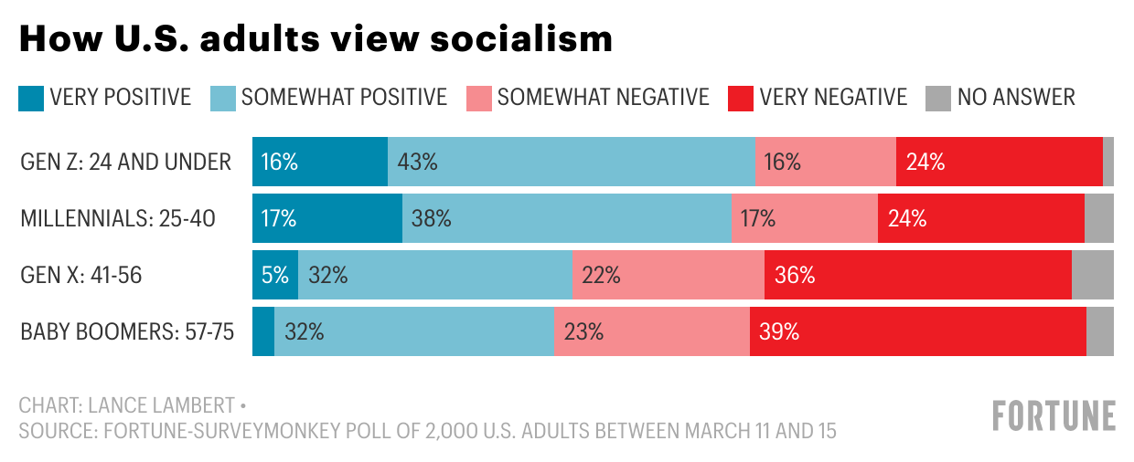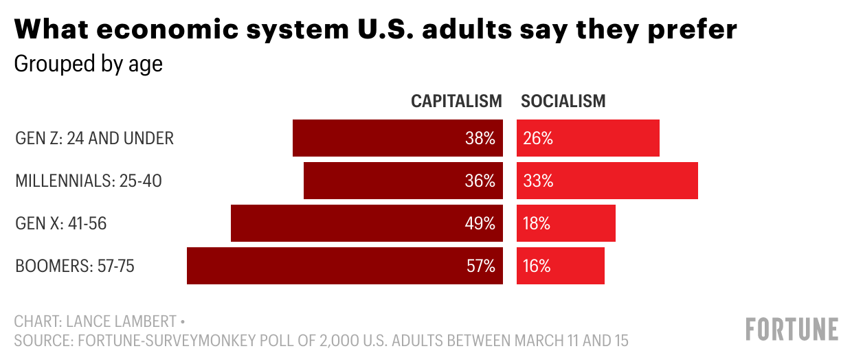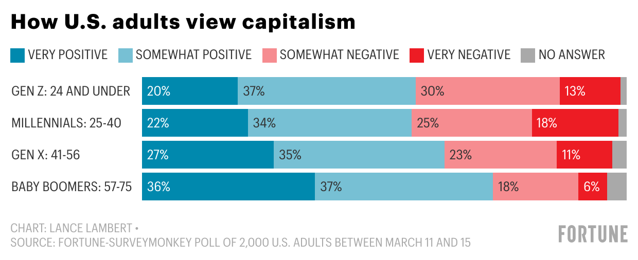 Fortune-Survey has found that Gen Z views capitalism less favorably than older generations. We teamed up with SurveyMonkey to poll 2,000 adults in the U.S. between March 11 and 15* on their sentiments towards “capitalism” and “socialism,” concepts they defined on their own terms.