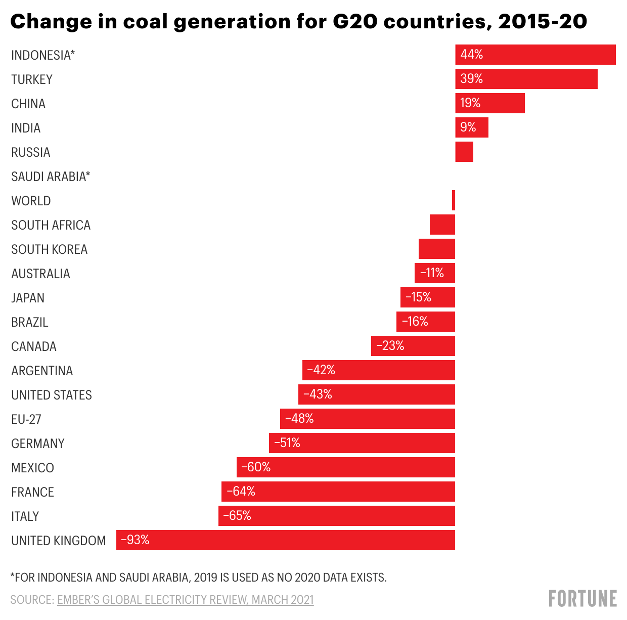 According to Ember, China was the only G20 nation to increase coal-generation last year, with a 2% uptick. China is also among the largest foreign investors in new fossil fuel projects. In 2018, over 40% of funding from President Xi Jinping’s signature Belt and Road Initiative was plowed into coal projects.