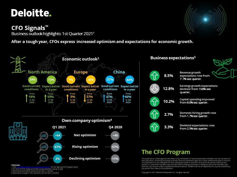 The outlook of CFOs appears to have improved overall in Q1 2021, a report by Deloitte found. Four key operating metrics were trending upwards, except for earnings growth. “CFOs have a greater appetite for risk-taking,” according to the report.