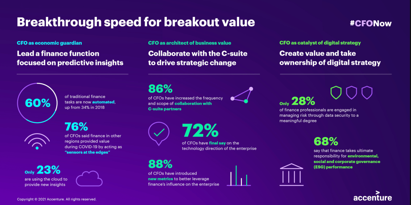 A recent report by Accenture highlighted an "elite group" among CFOs surveyed that have transformed their roles effectively, resulting in positive changes to their organizations' top-line growth and bottom-line profitability. "In organizations that far exceeded revenue growth expectations over the past year, CFOs have occupied new and expanded roles: economic guardian, architect of business value and catalyst of digital strategy," according to Accenture.