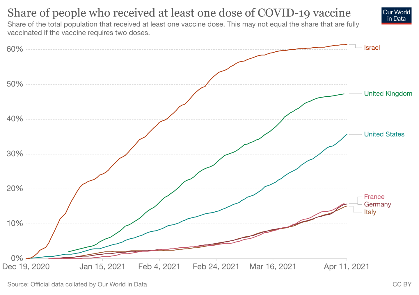 As of April 12, Germany, France, and Italy had given COVID vaccinations to roughly 15% of the population—a rate that significantly trails the U.S. and Britain.