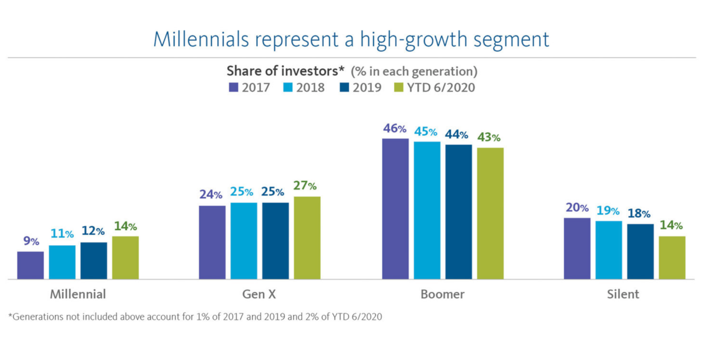 A new quantitative study released by Broadridge Financial Solutions, Inc., a global fintech company, provides data and the observations of investors who buy mutual funds, ETFs and equities through financial intermediaries. "We are all witnessing an unprecedented and accelerated democratization of U.S. investing," Broadridge's Investor Communication Solutions President Bob Schifellite said in the announcement. "The signs are undeniable as younger investors, particularly Millennials, grew as a percentage of investors studied from 9% to 14% during this period."