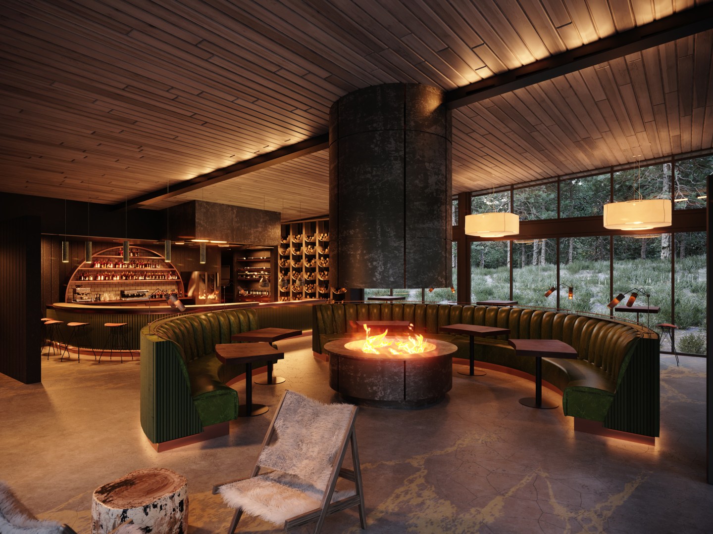 “I think the effects of the pandemic this past year will definitely influence how we experience public spaces moving forward,” says Kristen Becker, partner at Seattle-based Mutuus Studio. The architecture firm is behind the Social Haus, a restaurant at the Green O, a luxury woodland retreat opening this June in Greenough, Mont. The project began about a year ago, meaning the pandemic informed some of the firm’s design choices.