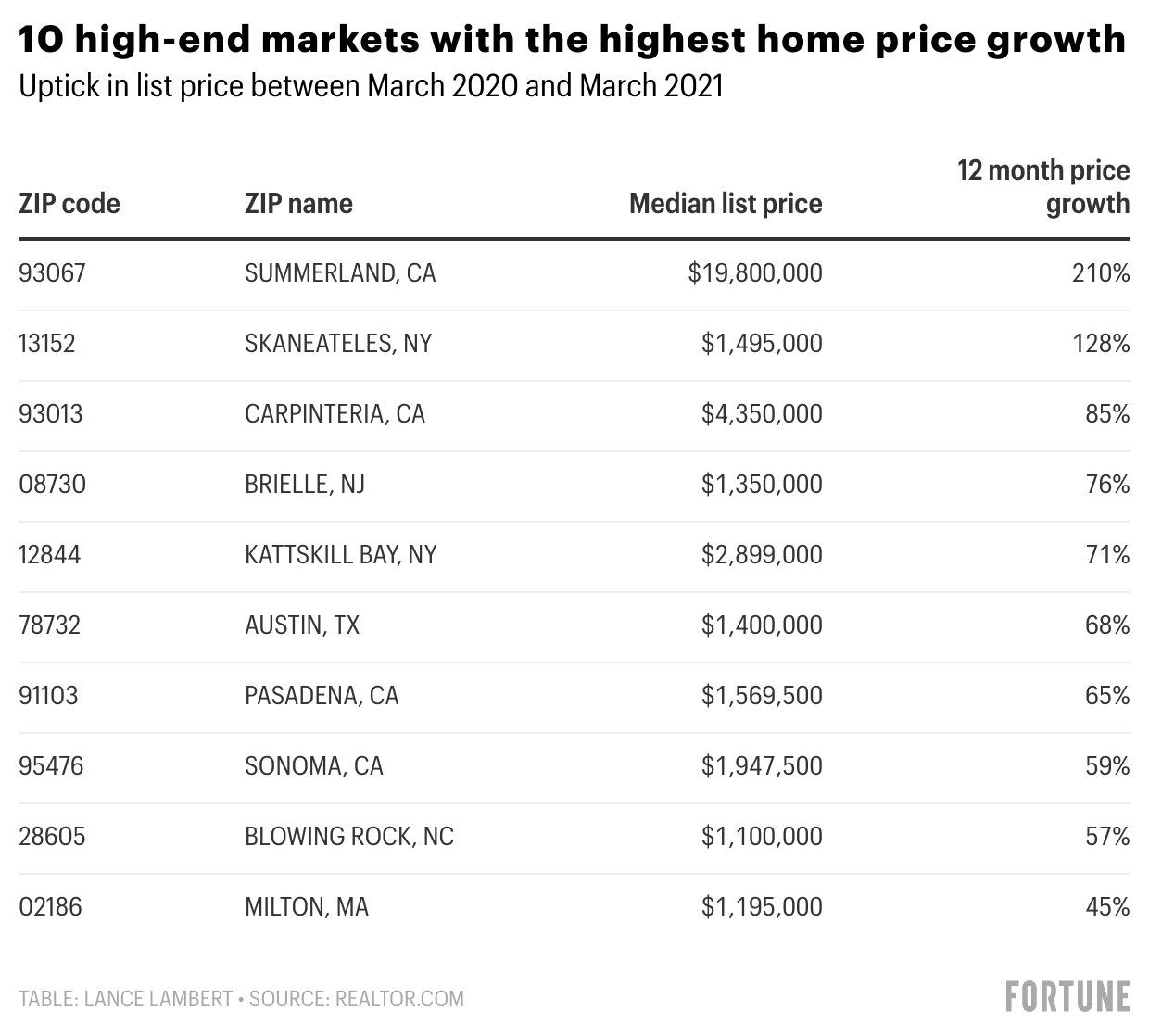 In the Hamptons that translated into a 15.3% average price jump. Undoubtedly, a solid gain. But it turns out the most earth-shattering numbers weren’t posted in big-name ritzy enclaves. The real run-ups were instead happening in less publicized high-end markets and up-and-coming luxury neighborhoods. That’s what Fortune found when we looked at realtor.com price data to find the luxury markets with the most price appreciation during the pandemic.