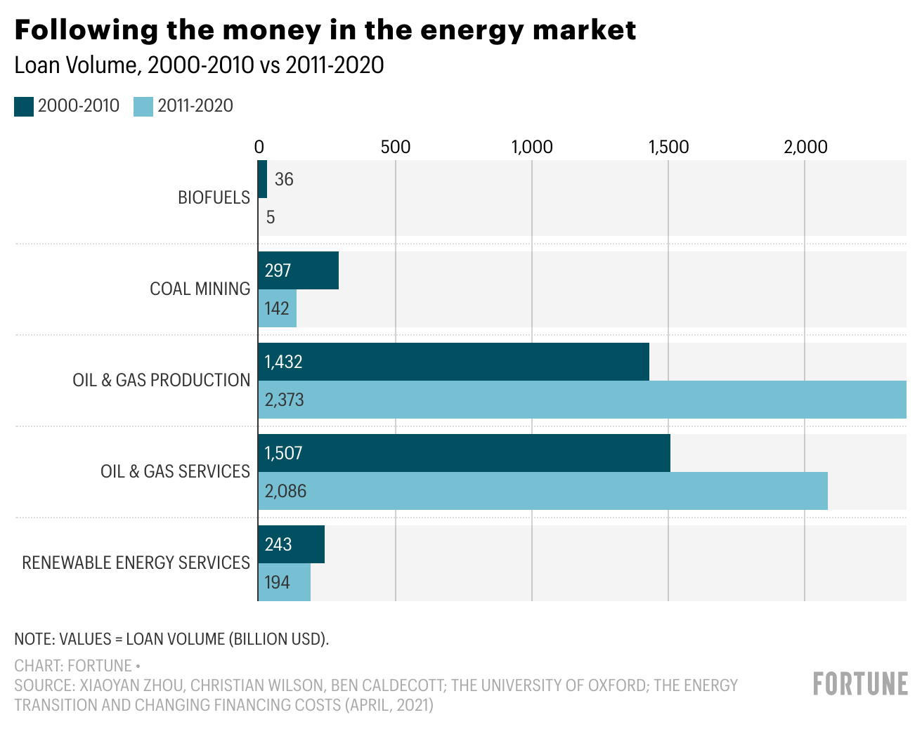 The report, out of Oxford’s Sustainable Finance Program, sought to track shifts in which sectors were getting financing, and at what cost, over the past two decades.