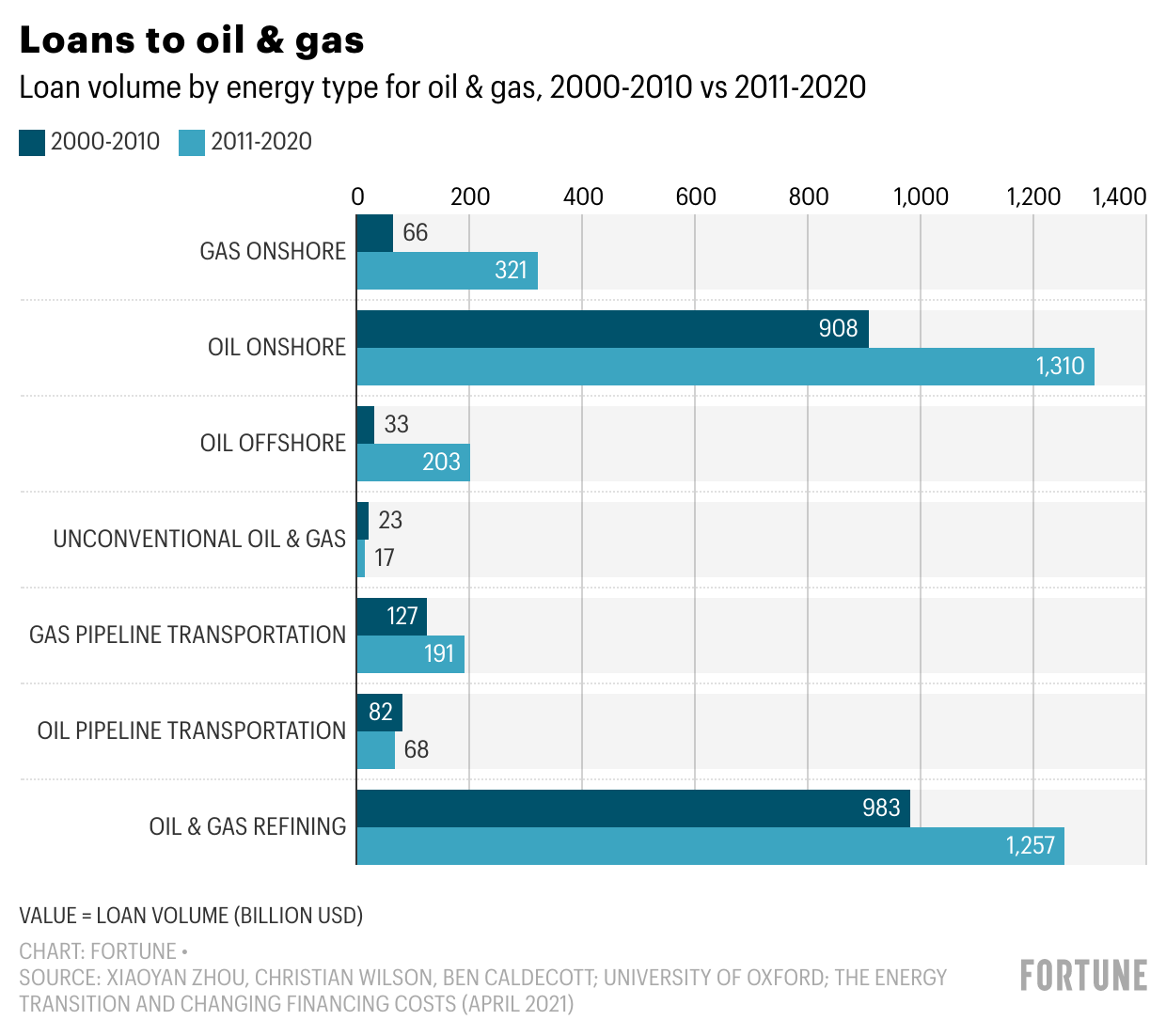 Zoom out a bit farther to energy financing as a whole, and oil and gas financing still remains brisk. Only pipeline financing, and financing for unconventional oil and gas—usually associated with shale production—declined over the past decade.