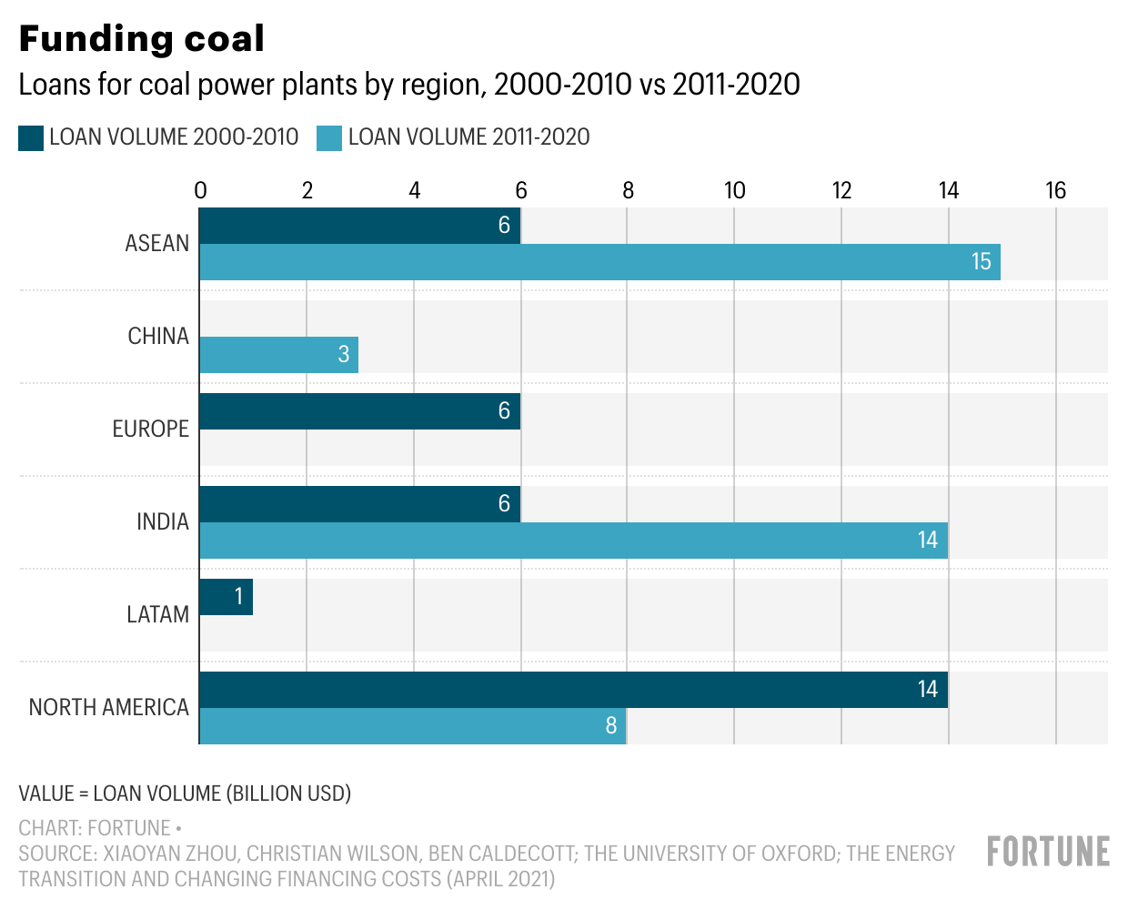 Loan volumes for coal mining projects decreased sharply worldwide over the last decade. But when it comes to funding coal-fueled power plants for electricity, however, there are sharp regional divides: Such funding essentially evaporated in Europe in the past decade, and declined by nearly half in North America. In China, India, and the rest of Asia, however, coal power plants were still a rising force.