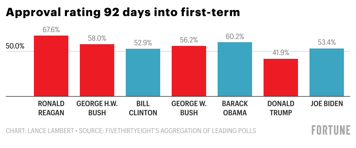 But all presidential honeymoons aren’t created equally. That begs the question: How does the approval rating of President Joe Biden—who’s been in office 92 days—stack up to past occupants at the same time in their presidencies?
