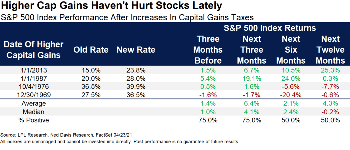 But what does it mean? Well, on the surface you’d think higher taxes wouldn’t be a good thing, but that’s actually not reality. In fact, the past two times we had an increase in the capital gains tax stocks did really well for the next six months in 1987 and 2013. Of course, stocks did poorly after the hikes of 1969 and 1976, so we have a mixed bag. But could it be as simple as those times weren’t the best for the economy, while in 1987 and 2013 the economy was healthy? For now, we’d side with an improving economy and accommodative Fed will take the higher coming taxes in stride.