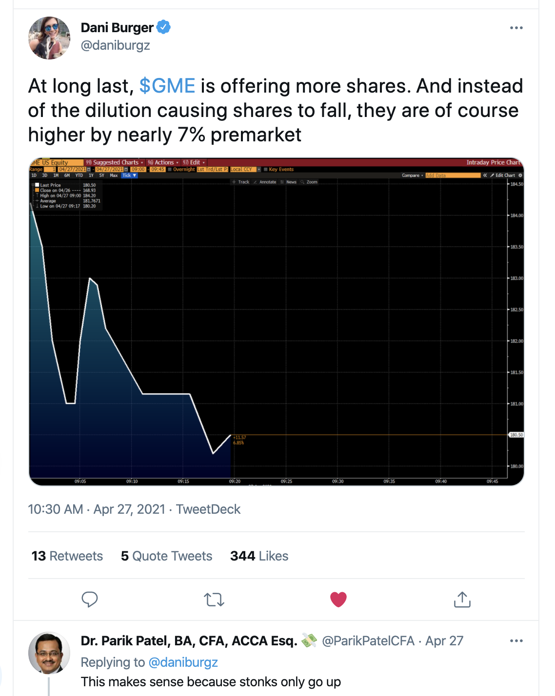 As my nephew reminded me via text, GME is up big in recent days. That always happens when your shares get diluted. Always.
