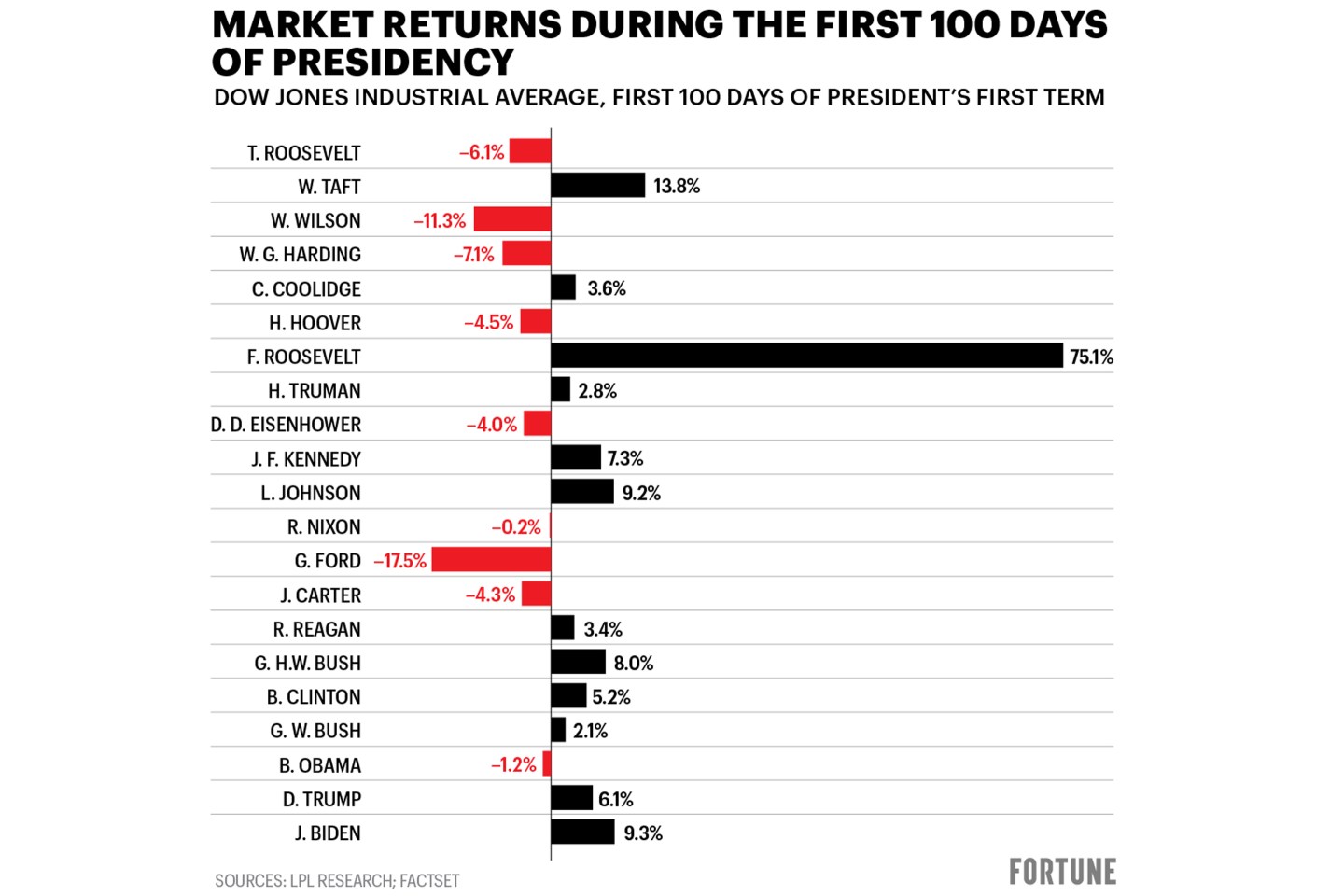 The benchmark S&P 500 had an even better stretch, gaining 10% in that period. Of course, we should not be judging a presidency by the ups and downs of the stock market. But as LPL Financial’s chief market strategist Ryan Detrick tells Fortune‘s Anne Sraders, “we think it means, whether you like Joe Biden’s policies or not, the stock market is saying things are getting better.”
