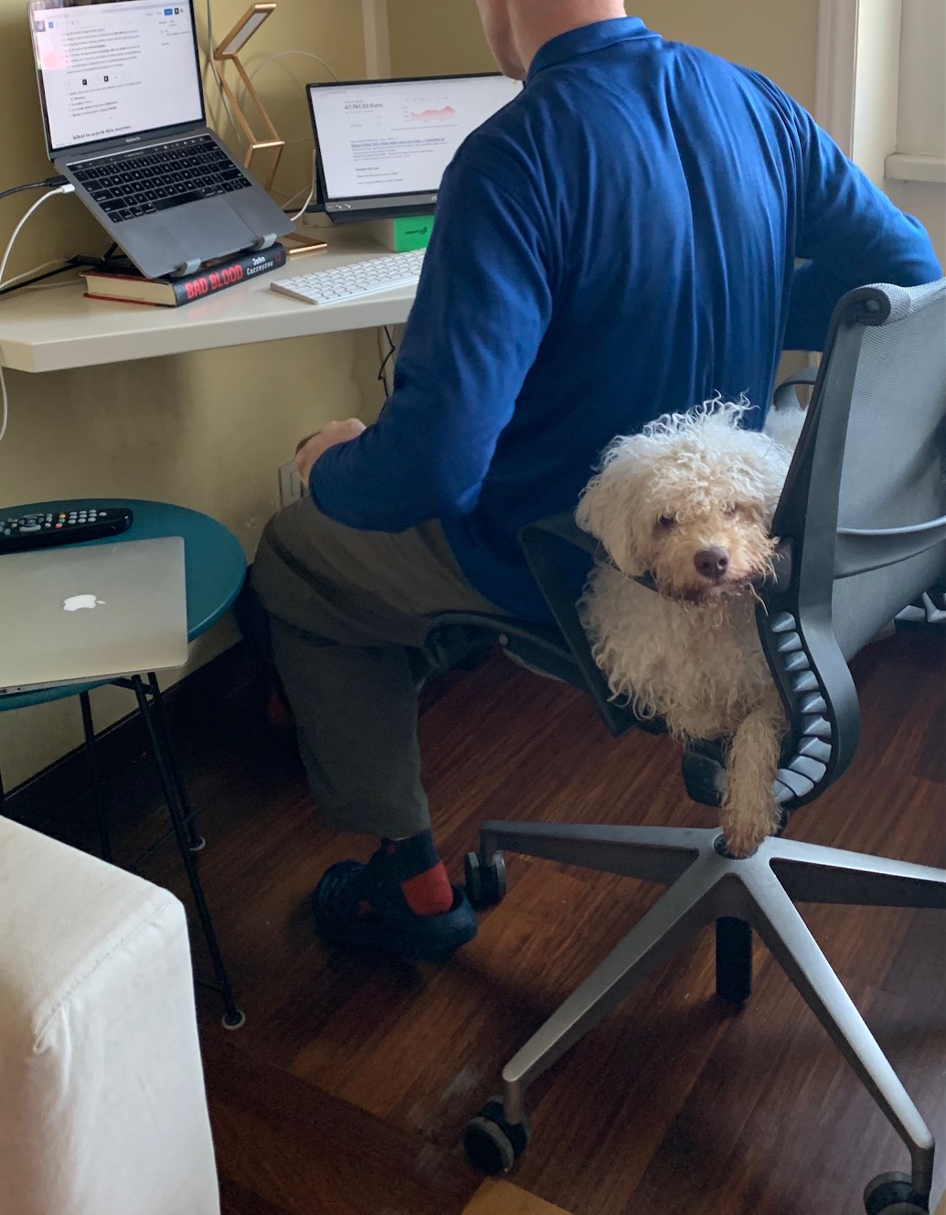 Hey, you have a nice Aeron chair. I have this little doggy bed that smells like…like… like dog. Move over, Mr. Fancy Chair. I’m going to ball up behind you. Like that. That’s better.