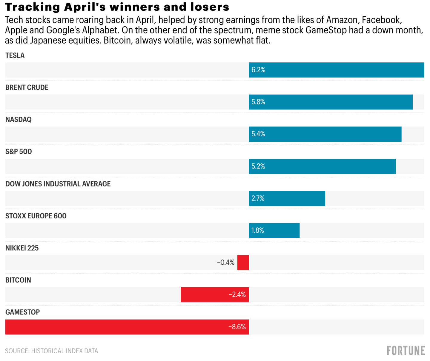 The other big winners in April were, somewhat paradoxically, Tesla and crude oil. Brent continues to charge higher, up roughly 25% this year, as global demand for oil climbs and the global economy continues to recover. After April’s rally, meanwhile, Tesla is up a mere 0.5% in 2021.