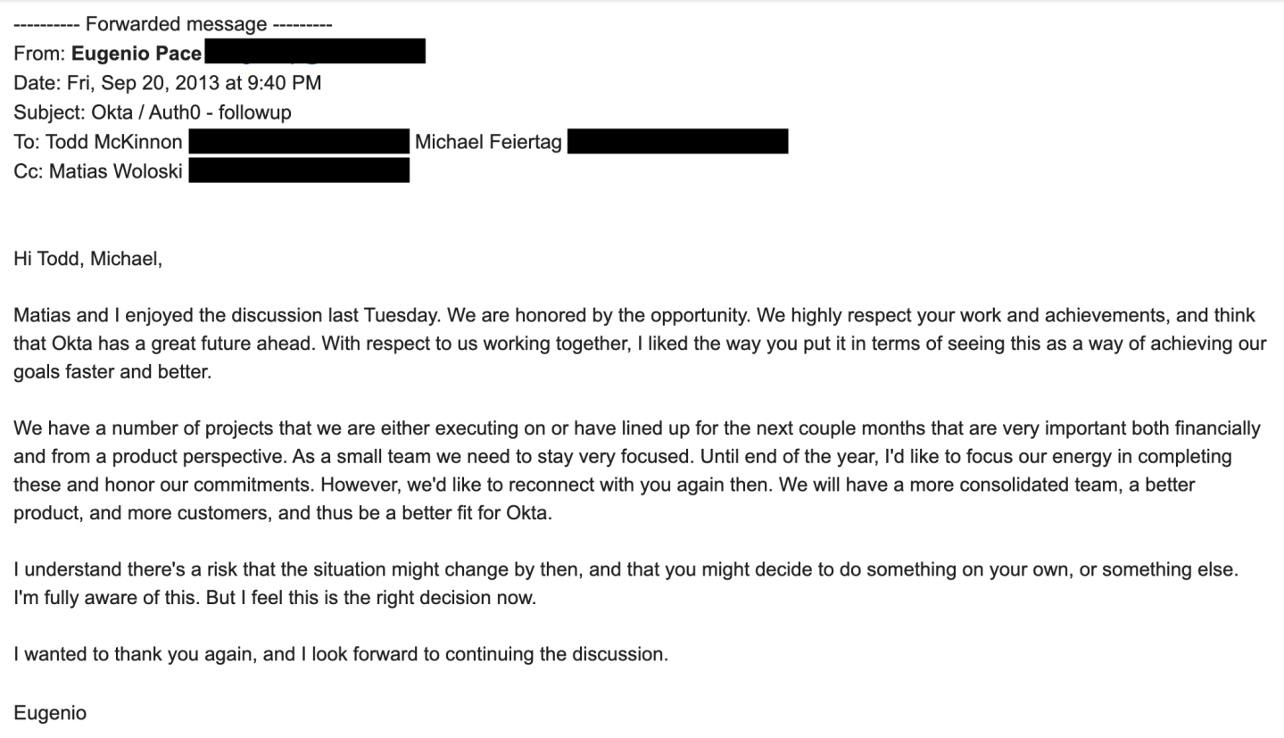 Auth0 founder Eugenio Pace sent an email to Okta’s leadership declining a takeover offer in 2013.