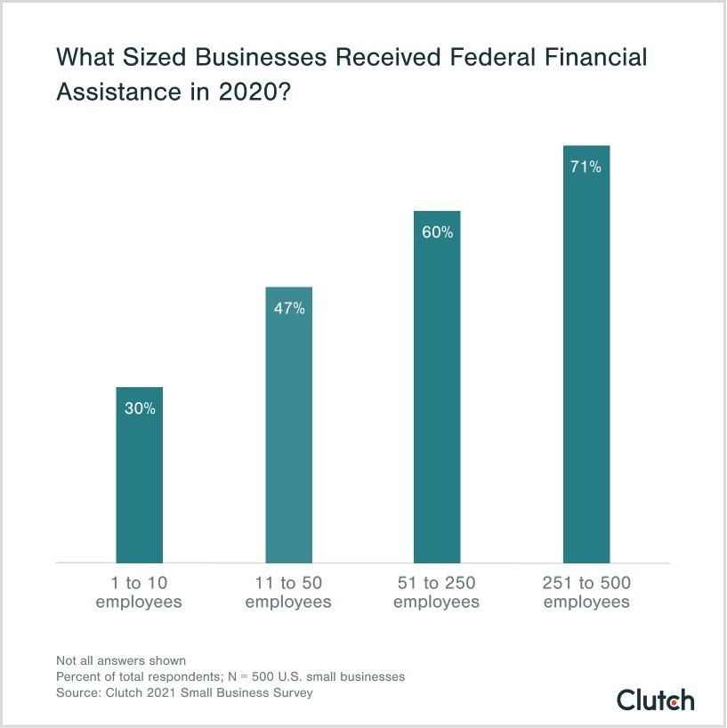 In response to the coronavirus pandemic, the U.S. Small Business Administration offered financial assistance and loans for small businesses. But businesses with 251 to 500 employees received greater federal financial assistance, according to a new survey by Clutch, a B2B research, ratings, and reviews firm. Experts say larger companies may have had an advantage due to more accountants, advisors, and consultants available to complete the "sometimes burdensome application process," the report found.