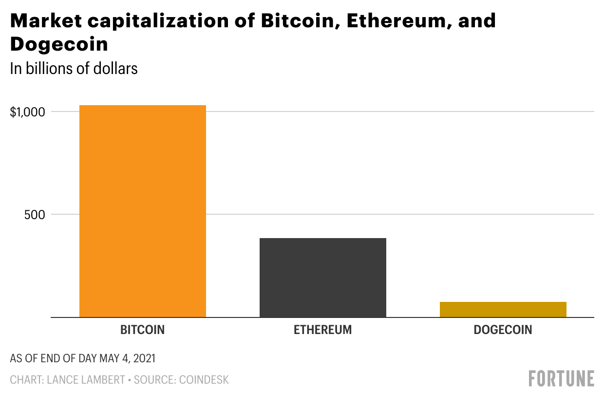 While major cryptocurrencies are up across the board, the gains of Dogecoin in particular are off the charts. The reason? For starters, its capitalization is far smaller than some of the other major cryptocurrencies—meaning an influx of new money will create a higher percentage gain than if the same amount went into Bitcoin or Ethereum. As of the end of the day Tuesday, the market capitalization of Dogecoin stands at $86 billion, according to Coindesk. That’s compared with market caps of $375 billion and $1 trillion, respectively, for Ethereum and Bitcoin.