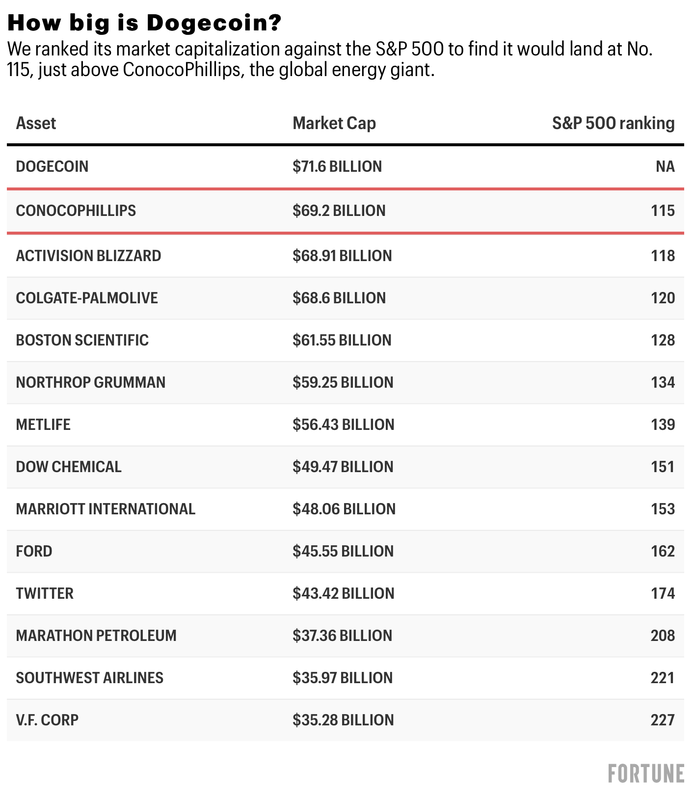 As the chart above shows, Dogecoin is more valuable than oil giants, airlines, carmakers, software companies, and insurance companies. It’s bigger than profitable companies. It’s bigger than companies that make things, and innovate. It’s bigger than companies that have built and grown cherished global brands. It’s bigger than companies that employ a lot of people, and create real economic value.