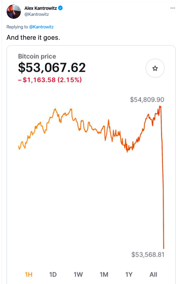 The difference today: there’s no relief in crypto. Tesla CEO Elon Musk dropped a bomb yesterday evening, Tweeting the company will no longer takeBitcoin for purchases on account of [checks notes] …oh, right, the planet.