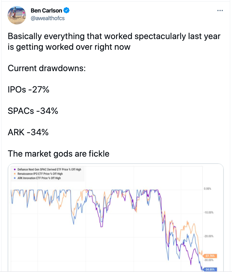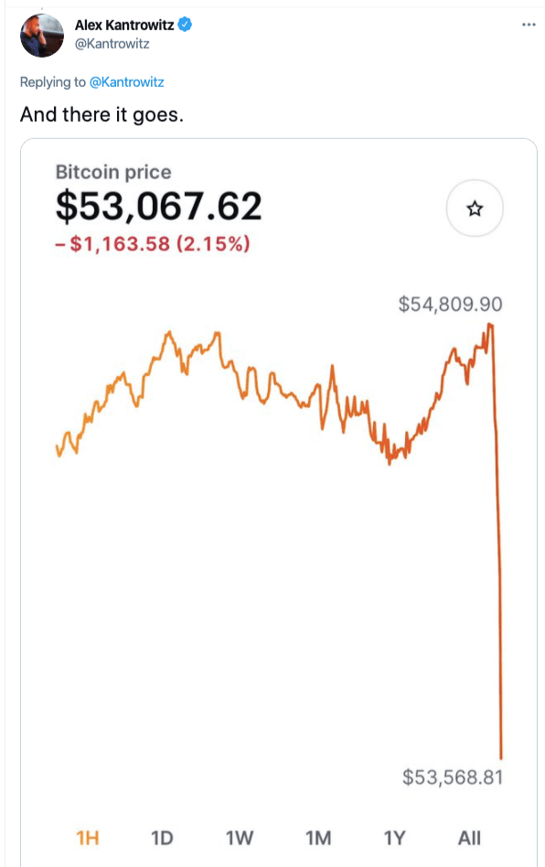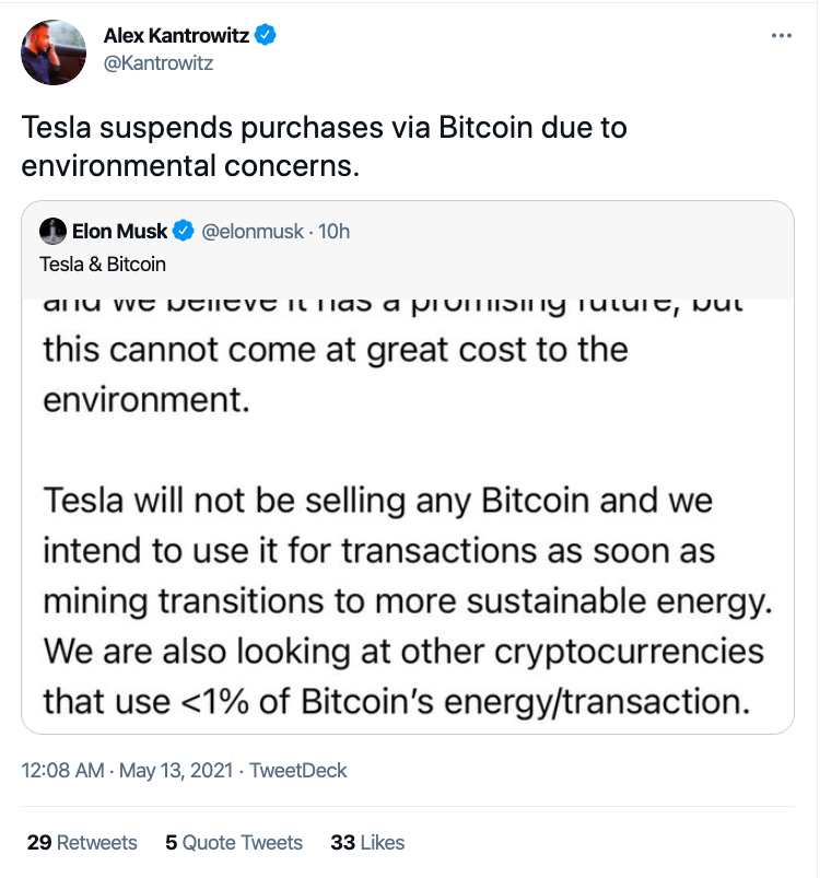 The difference today: there’s no relief in crypto. Tesla CEO Elon Musk dropped a bomb yesterday evening, Tweeting the company will no longer take Bitcoin for purchases on account of [checks notes] …oh, right, the planet.