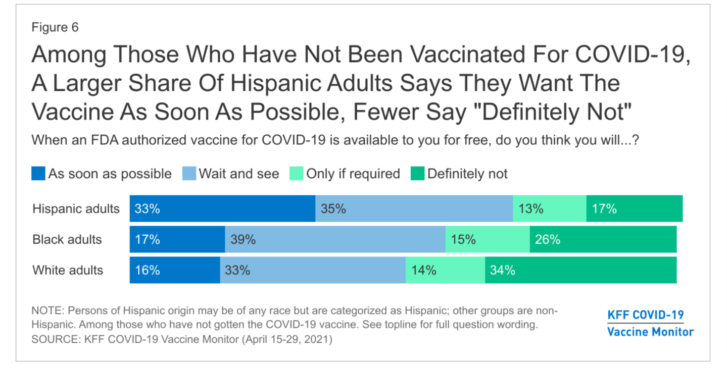 There’s no shortage of demand for COVID vaccines in the Hispanic community, according to a new survey of Americans who have yet to receive doses. The Kaiser Family Foundation (KFF) survey found that of Hispanic adult respondents, 33% said they want a vaccine as soon as possible, more than twice the percentage of white adults surveyed. The Hispanic community also has the lowest rate of people most skeptical of getting a vaccine compared with both white and Black Americans.