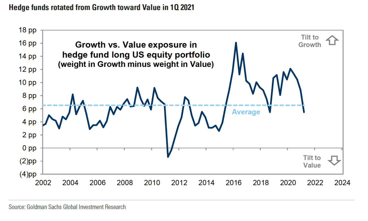 Bull Sheet readers are certainly well versed in thevalue > growth narrative that’s dominated the markets since the start of the year. Goldman Sachs has new data out showing hedge funds aggressively rotated out of momentum stocks in Q1 and into value (primarily energy and financials) to a level that’s below the 20-year average. “Funds remain tilted towards Growth but their current tilt is now the smallest since 2018 and registers below the average since 2002. The shift away from Growth has been pronounced among extremely high-growth, high-multiple stocks,” Goldman wrote in an investor note. “The rotation away from Growth was also evident at the sector level.Funds cut their exposures most in Info Tech, Consumer Discretionary, and Comm Services. Tech remains the largest underweight relative to the Russell 3000 (-667 bp). In contrast, funds lifted their tilts towards Industrials, Materials, Energy, and Financials.”