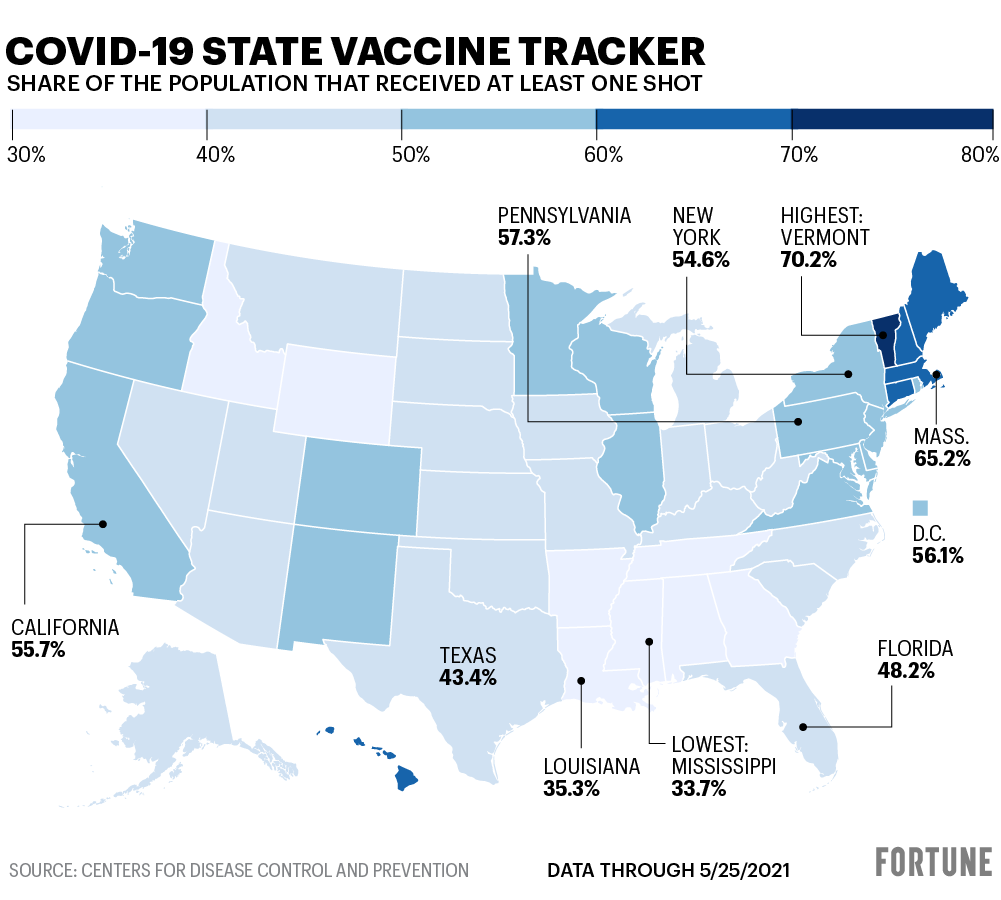 New England continues to outpace the rest of the nation, though 21 states, including California, Illinois, and New York, as well as the District of Columbia, have reached at least half their residents with at least one vaccine dose.