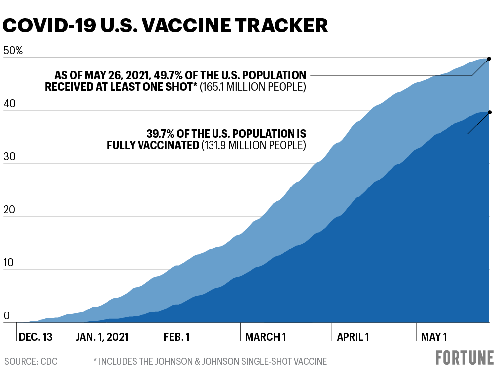 As of May 26, 129.8 million Americans—including 74.1% of seniors, 50.3% of adults, and 39.7% of the total population—are in that category, up from 125.5 million a week ago. The nation is poised to reach half of the total population with at least one vaccine dose by week’s end: 165.1 million people, or 49.7% of the population, currently have received at least one shot.
