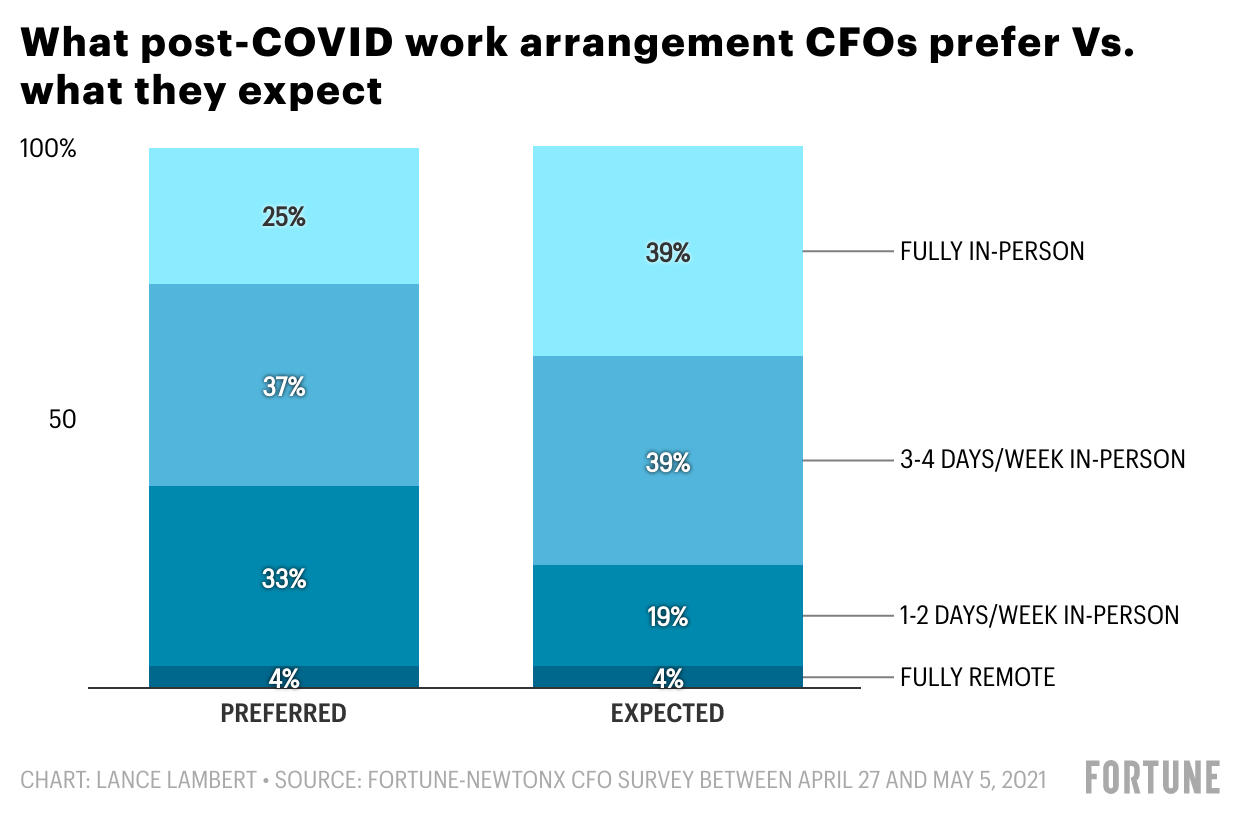 But many CFOs prefer that employees not return to a fully in-person work environment post-COVID. Flexible or hybrid, however you’d like to describe it, that’s their desired game plan.