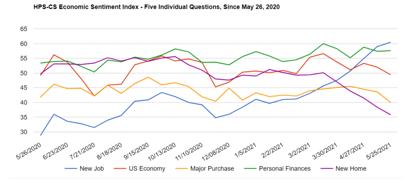 According to the latest HPS-CivicScience Economic Sentiment Index survey, Americans are feeling far more bullish about the jobs market than they are about the housing market. Their confidence in landing a new job (blue line) is soaring; finding a new house (magenta line) is tanking.