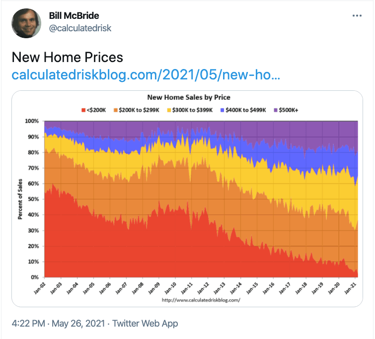I’ll help you out with the fine print here: homes costing $300,000 or more now make up about 60% of the market. A decade ago, they made up less than 30%, according to Calculated Risk.