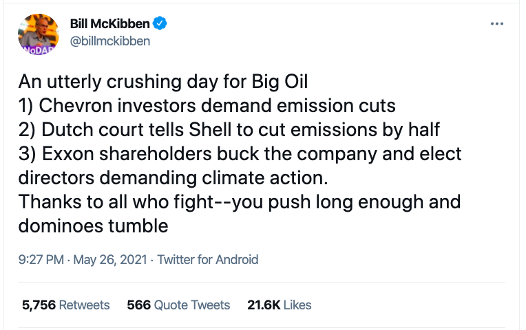 - Shares in Royal Dutch Shell were down 1% after a Dutch court ruled on Wednesday the oil and gas giant has to slash emissions further and faster than planned, saying it’s a big contributor to climate change. Now that they have powerful friends in the ESG investment community, climate hawks are feeling emboldened.