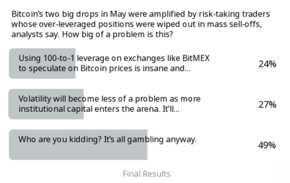 In the last Ledger poll, we asked you to weigh in about Bitcoin’s neck-breaking volatility. The winner was the YOLO option—”you only live once”—by a longshot, per the results below.