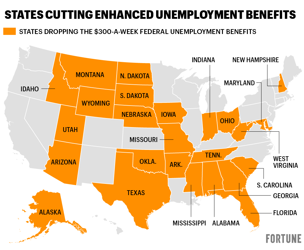 Most of the 25 states opting out of the program will do so before July 4. In Texas and Florida, the payments will stop the week of June 26. Meanwhile, Maryland and Tennessee will continue payments until July 3. As Fortune has previously reported, jobless residents in states that opt out of the $300 benefit will still receive regular, state-issued unemployment benefits. Jobless residents in states that do not opt out of the program will continue to receive the enhanced $300 unemployment through the week of Sept. 6.