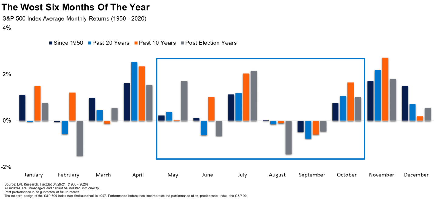The markets are down for the week, which is hardly a surprise to Wall Street data-crunchers. If there are seasons to the markets, then we’re about to enter a slow one. Going back to 1950, the S&P 500 in the May-through-October period has historically underperformed, as LPL Research breaks out in the below chart. And June has been a particular dud, on average, over the past 20 years.