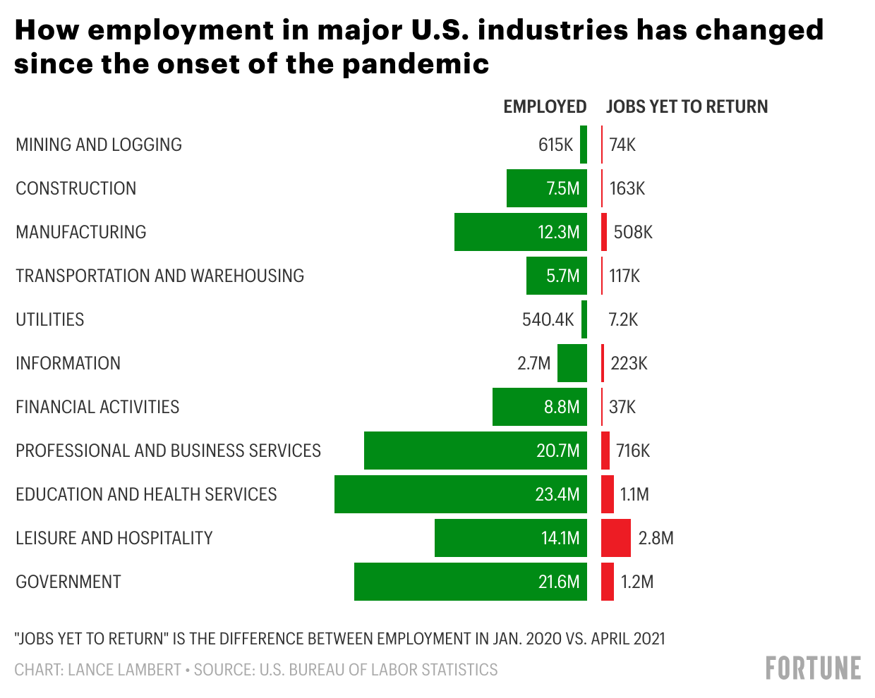 But this isn’t the pre-pandemic economy. A lot has changed—some of it permanently. For starters, the pandemic-spurred digital explosion has killed off some jobs while creating new opportunities for others. As workers consider exploring this hot job market, Fortune looked through the data to identify where applicants can find opportunity.
