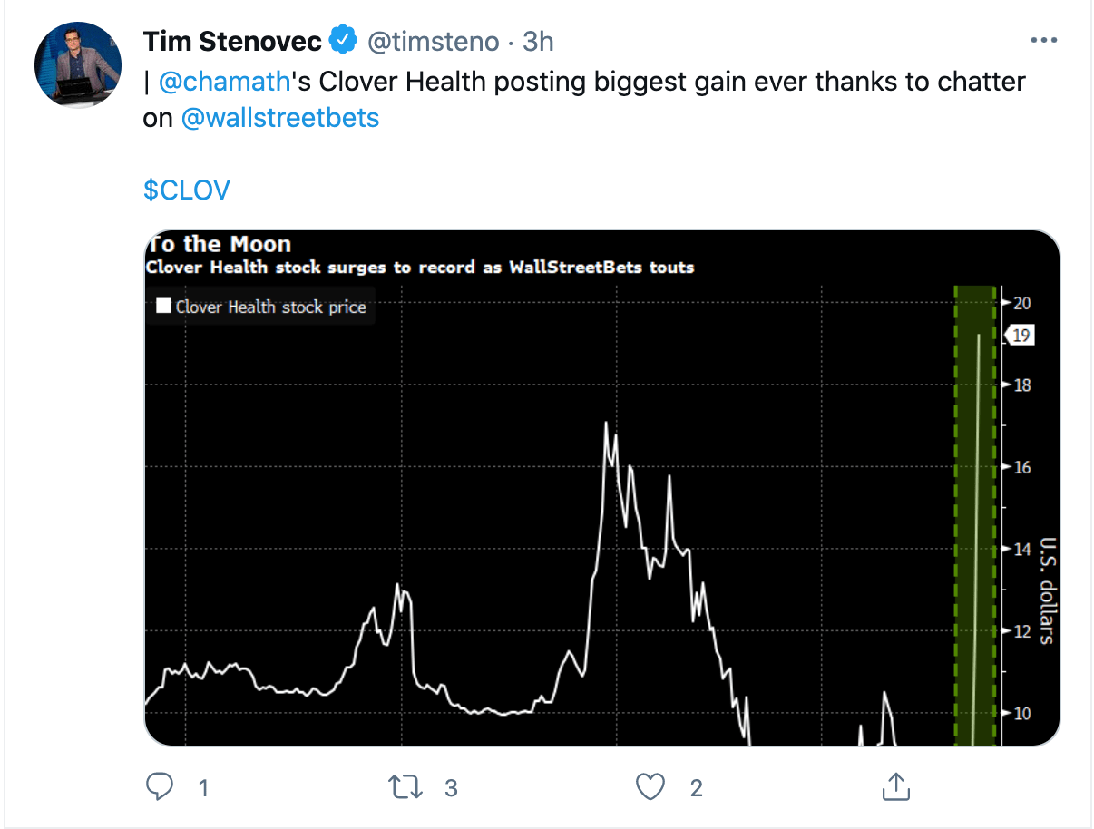 As Fortune‘s Morris wrote Tuesday, the rise of Clover Health in the Reddit-sphere “was a fast-growing phenomenon. As of 8:38 a.m. ET yesterday, there were less than 100 comments on the stock on WSB’s popular daily discussion thread, according to Quiver Quantitative, an alternative data analytics company. By the same time today, that number was up to 2,747.”