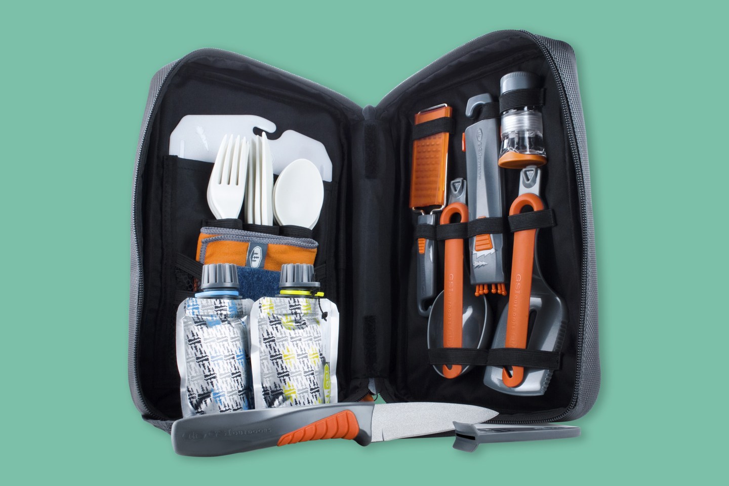 Camp kitchen: For the couple who love to camp, this handy outdoor kitchen set for two elevates everyday gear. The compact 24-piece set in a ballistic nylon case holds such basics as flatware, cookware, a knife, and condiment bottles, all weighing less than two pounds. SRP: $55
