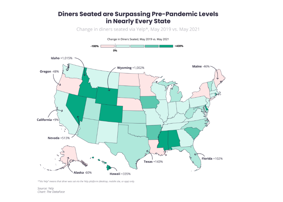 The states that saw the biggest spikes in diners seated were Idaho (up 1,015%), Wyoming (up 1,002%), Nevada (up 513%), Delaware (up 422%), Alabama (up 386%), Mississippi (up 364%), Hawaii (up 335%), and Colorado (up 321%). Texas—one of the first states to lift mask mandates and reopen businesses to full capacity—saw a 143% spike in diners seated compared with May 2019. The biggest hotspots in the Lone Star state: Houston (up 213%), San Antonio (up 200%), Dallas (up 126%), and Austin (up 85%).