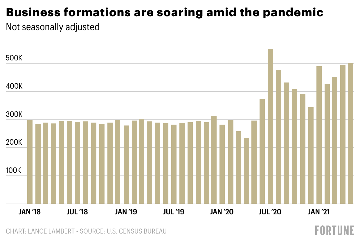 Since mid-2020, new business applications have been rising, up nearly 70% year-over-year in May 2021, per the latest U.S. Census Bureau data.