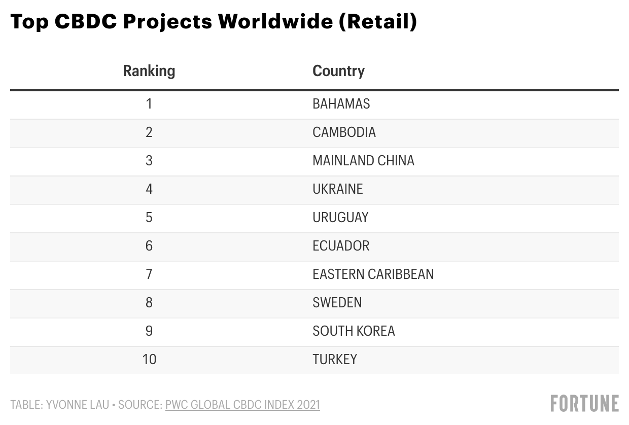 Based on project maturity, three of the world’s top ten retail projects—aimed at creating a digital currency that individuals and companies can use as digital cash—are located in Cambodia, China and South Korea, according to PwC’s first-ever CBDC Global Index. China especially is a standout; its People’s Bank of China (PBoC) became the first major central bank to launch a retail CBDC in April.