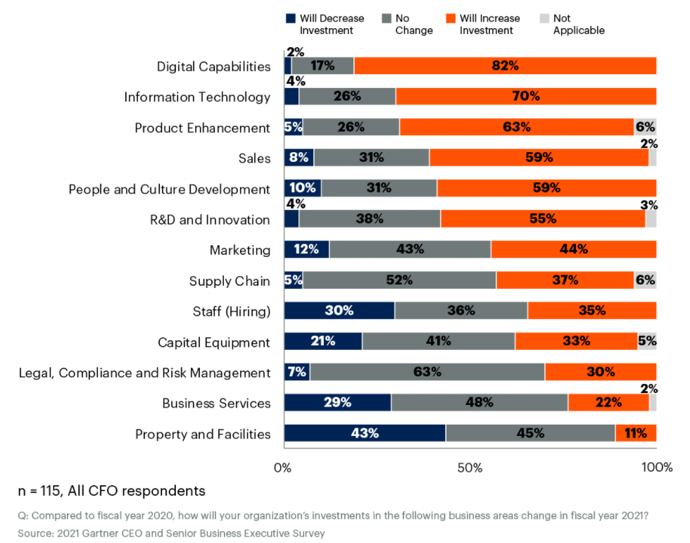 CFOs are making digital investments a priority in fiscal year 2021, according to a new survey by Gartner. The majority of respondents (82%) said they intend to increase investment in digital capabilities. Gartner offers the following commendations for CFOs planning their next digital steps: maintain a balanced tech investment portfolio; select technologies based on the needs of finance instead of market trends; early involvement with cross-functional stakeholders.